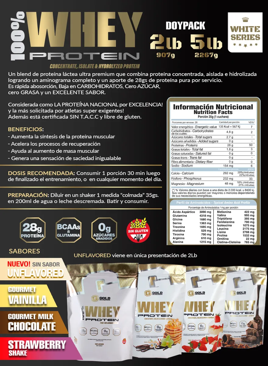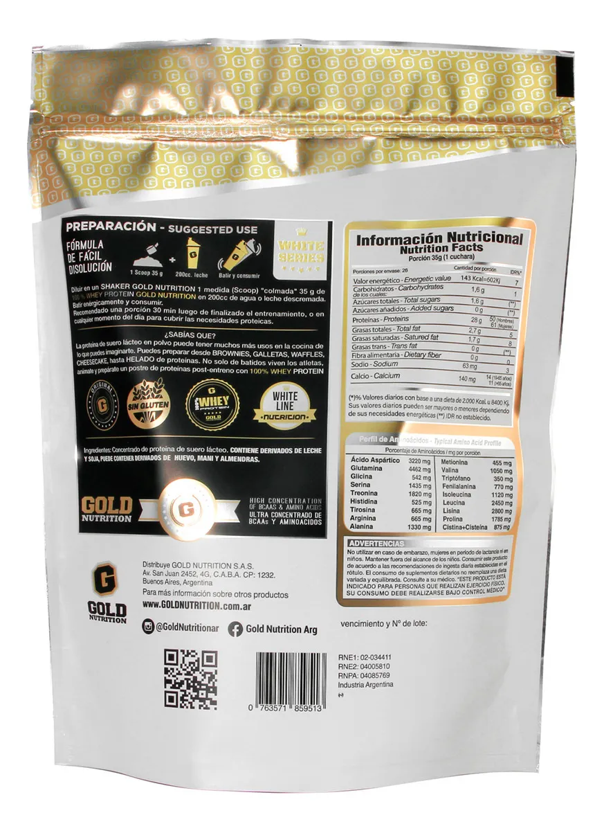 Whey Protein 100% Gold Nutrition es una proteína de suero de leche concentrada, diseñada para apoyar la recuperación muscular y el aumento de masa magra. Su fórmula pura y de alta calidad aporta aminoácidos esenciales (BCAA y L-glutamina) que favorecen la síntesis proteica y ayudan a reducir la fatiga post-entrenamiento.